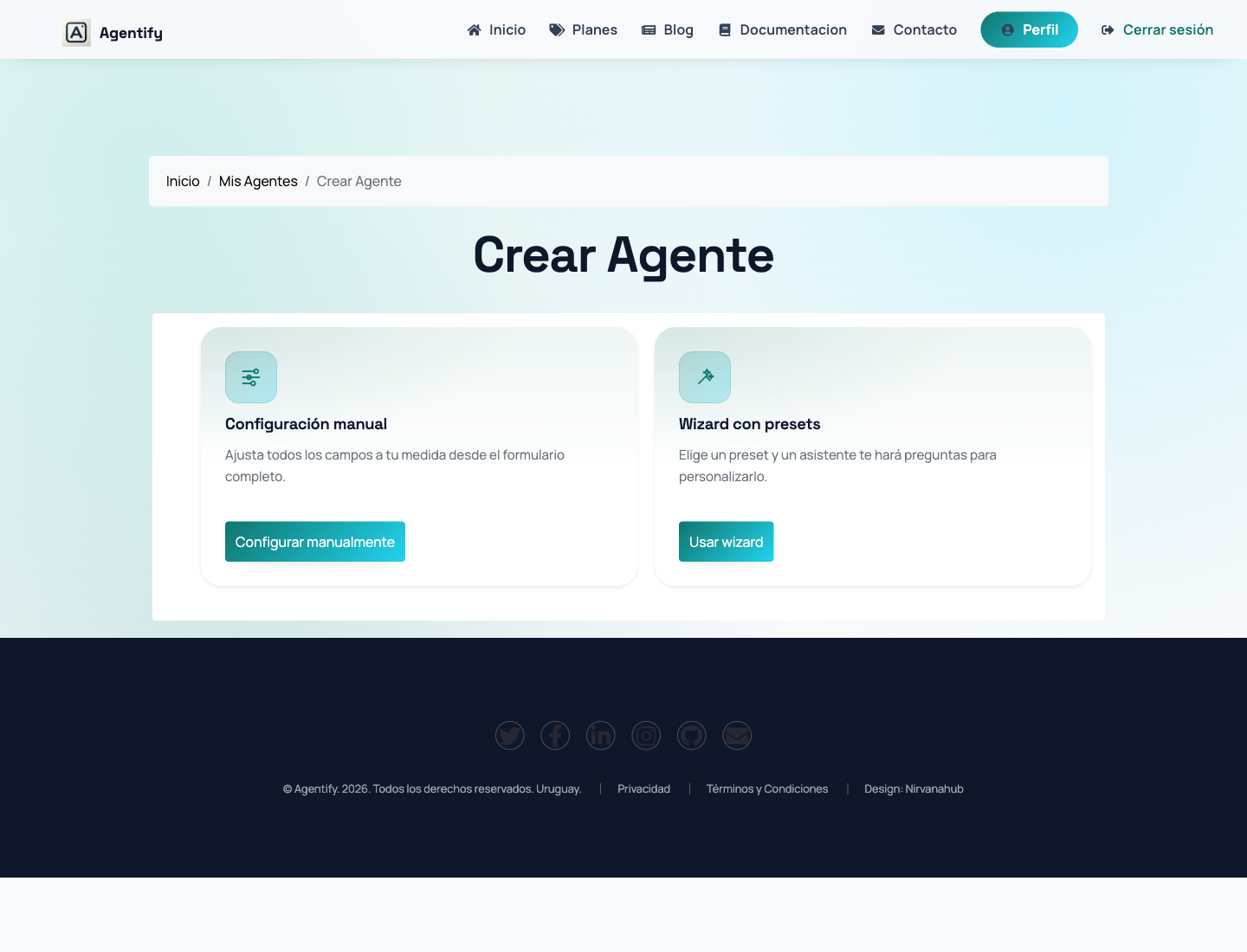 Para crear agente con asistente (wizard), seguí estos pasos en la UI: