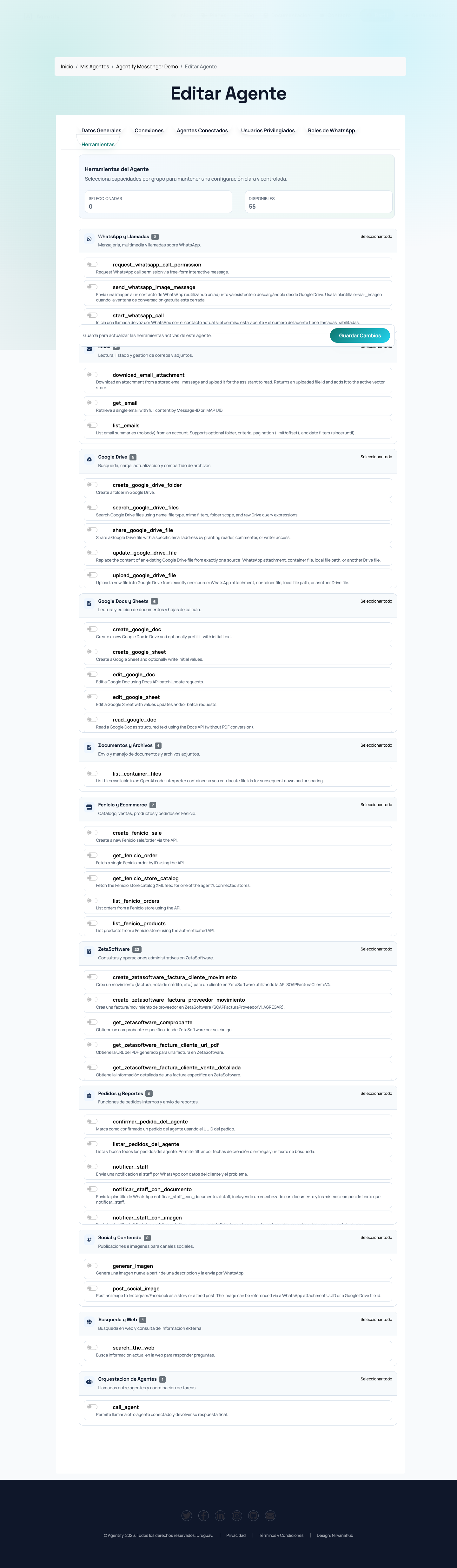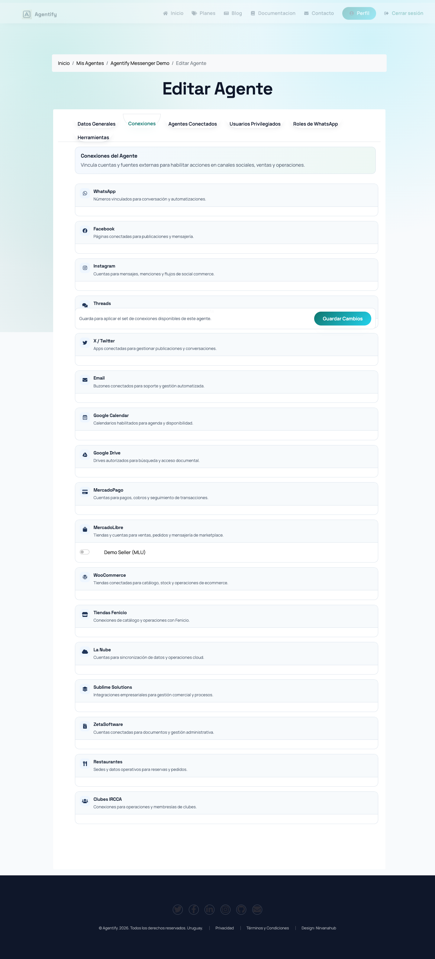 En Conexiones eliges las cuentas y sistemas que el agente puede usar. Según tu cuenta, puede incluir: