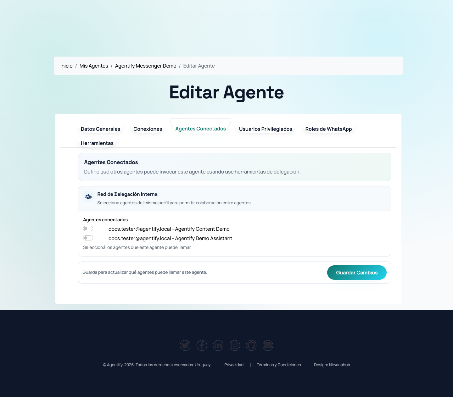 En Agentes Conectados defines que otros agentes del mismo perfil pueden ser invocados por este agente para delegar tareas.
